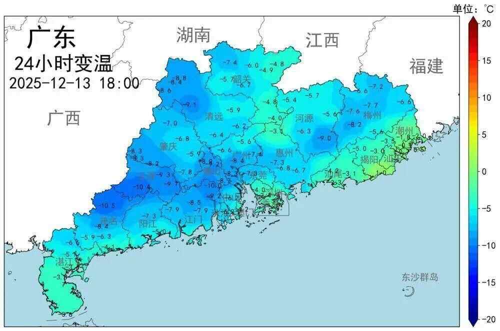 根据广东省气象部门统计,截至13日18时,广东除东南沿海极个别国家基本气象站外,其余大部分国家基本气象站均已录得24小时同比降温。其中茂名、云浮、江门等地录得24小时超10℃的同比降温。