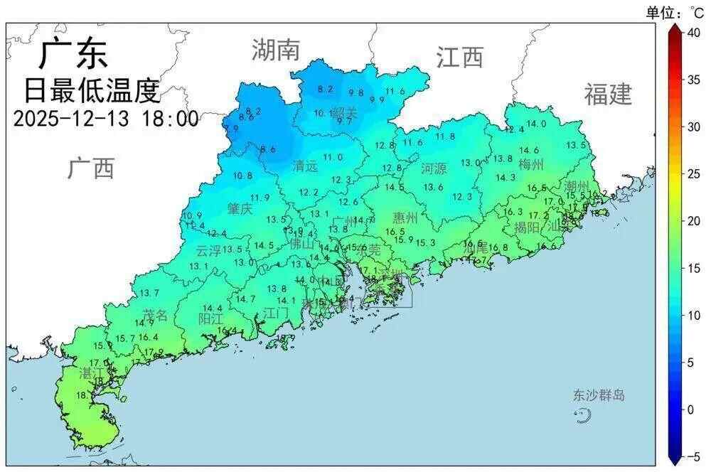广东省气象台12月13日傍晚预计,14日广东大部降雨减弱,但气温仍低。预计14日或15日早晨,广东各地将出现本轮冷空气影响下的过程最低气温,其中粤北和珠三角北部市县3℃~7℃,高海拔山区0℃左右局部有霜(冰)冻,广东南部市县12℃~15℃,广东其余市县8℃~11℃。预计15日白天起,广东气温逐步回升。