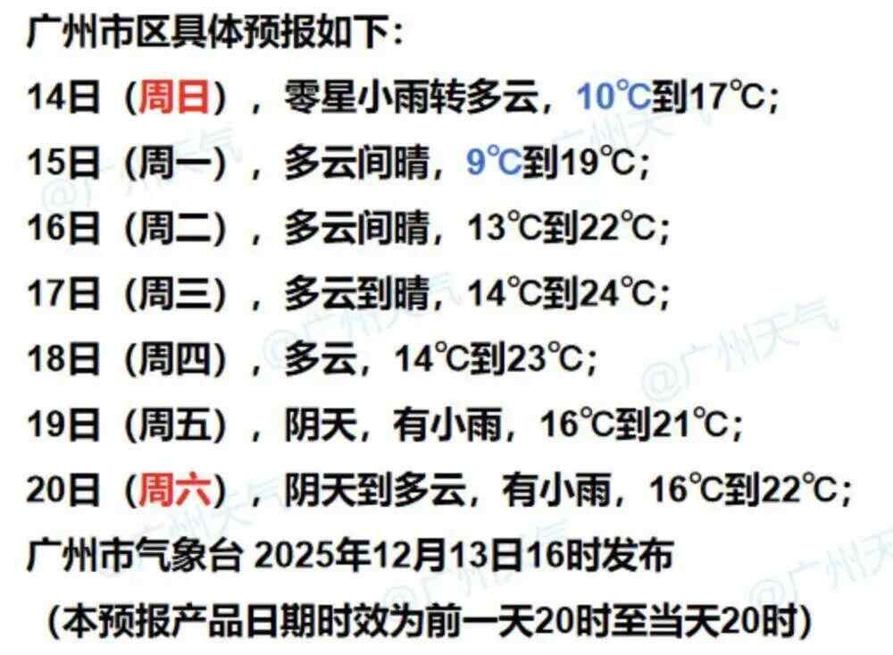 另据广州市气象台13日傍晚预计,14日至15日广州零星小雨转多云,其中14日陆地阵风5~6级,港区和高地阵风6~8级,15日早晨出现冷空气过程最低气温,届时广州北部7℃~9℃(山区4℃~5℃)、中部9℃~11℃、南部11℃~13℃。预计16日至18日广州以多云间晴为主,最低气温回升至14℃左右,最高气温回升至24℃左右。