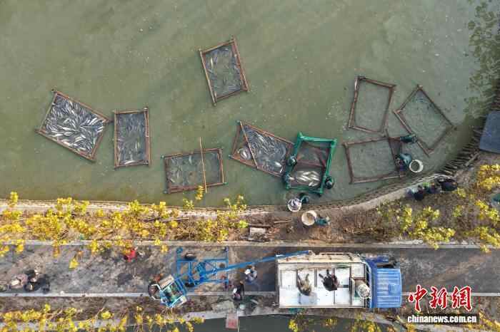 12月11日,刚捕捞上来的鲜鱼正被迅速装车,运往市场。近日,浙江湖州南浔的桑基鱼塘迎来冬捕忙季,“桑基鱼塘”是一套以“塘基种桑、桑叶喂蚕、蚕沙养鱼、鱼粪肥塘、塘泥壅桑”为基础的绿色农业生产方式,在当地已有千年历史。冬捕活动一般从每年12月开始,持续至春节之后。(无人机照片)中新社发 孙杨洋 摄