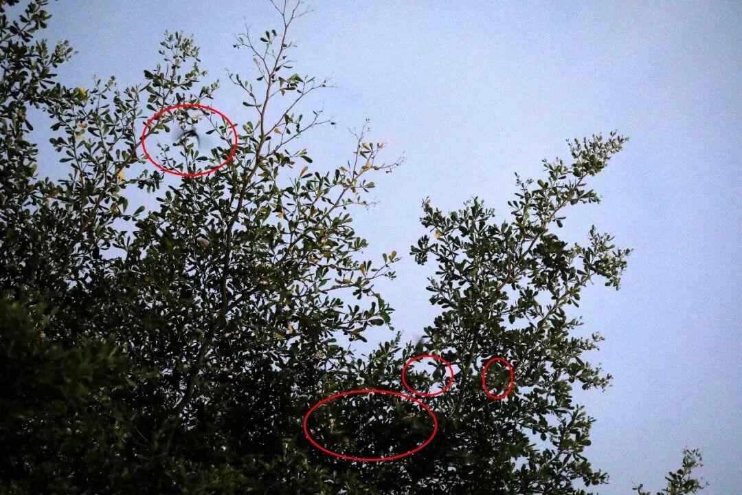 当天晚约6时,燕子觅食回来,多聚集于南国西路南侧的商务区路树上,办公区的工作人员已下班并熄灯,为燕子提供了一个相对适宜的“居住环境”。它们在空中翻飞,粗略估算约近万只,个头比平时在家门口筑巢的燕子要少一半,约麻雀大小,虽然飞行速度很快,但身上的白斑很明显。它们“叽叽喳喳”地争抢安睡的枝头,持续约半小时后,周边开始安静下来。