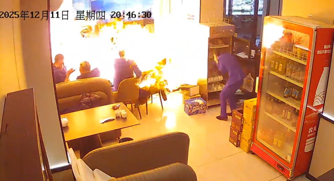同样惊险的一幕发生在山东烟台,11月30日三名男子在聚餐时,使用卡式炉煮火锅,在调试火力时,一股强气流突然将锅体掀翻。