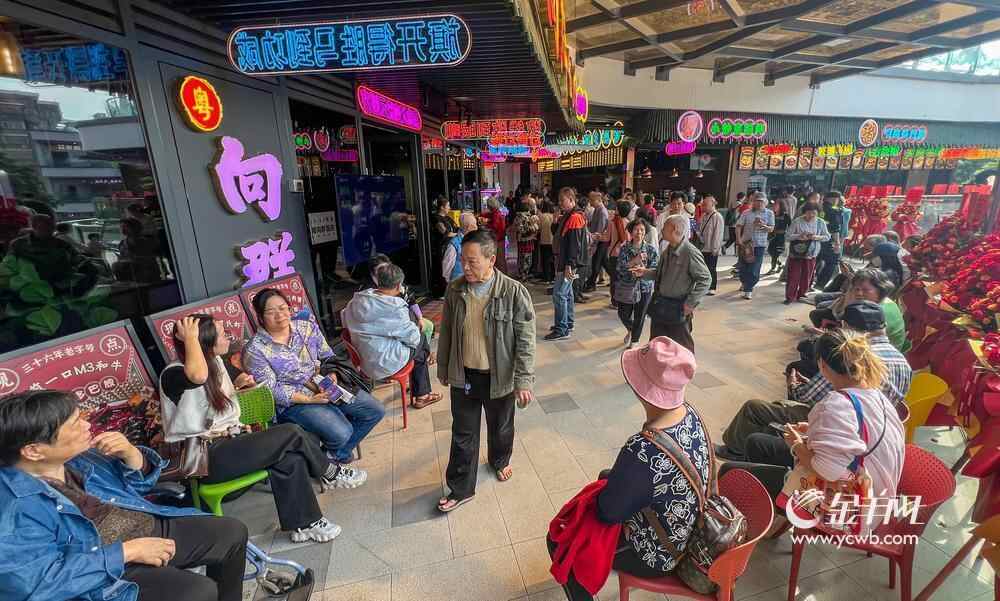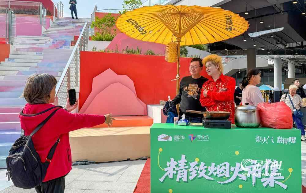 截至12日中午,记者在“宝悦坊”现场看到,多家餐饮商户门前已出现排队等位现象。为唤起市民对原宝业路“宵夜一条街”的情感记忆,项目运营方特邀昔日在该街区活跃的民间红人“炒螺明”到场互动,吸引众多街坊驻足合影。