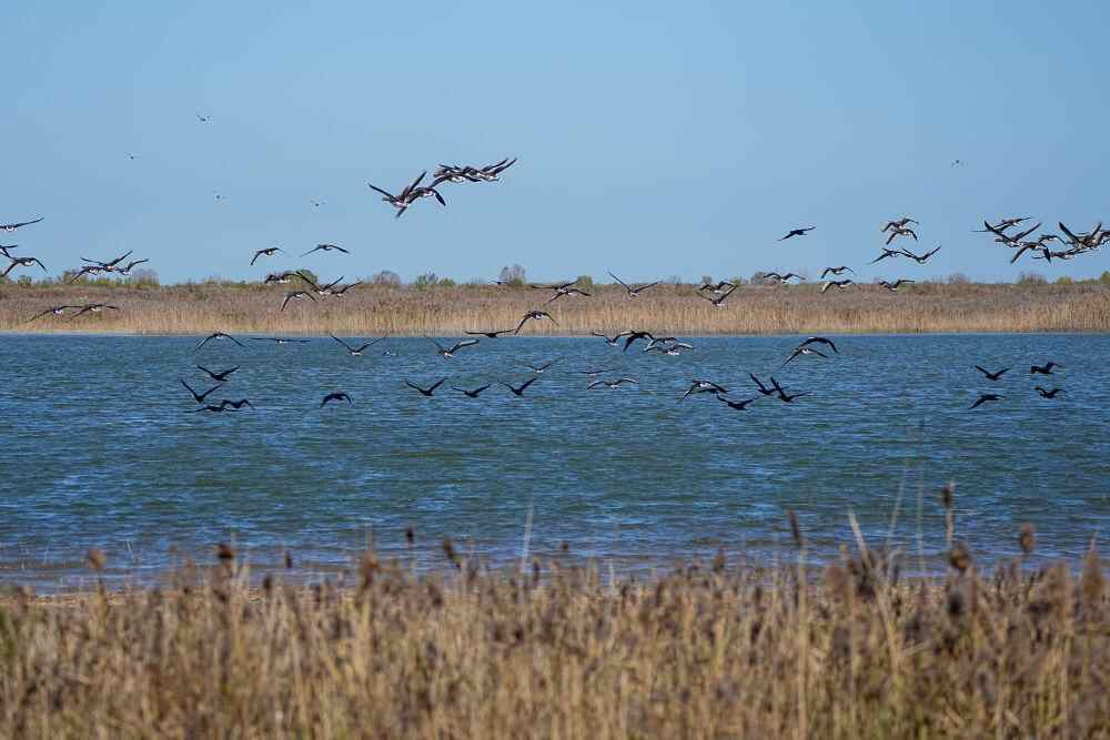 2025年11月13日,越冬候鸟在山东黄河三角洲国家级自然保护区飞翔。新华社记者 朱峥 摄