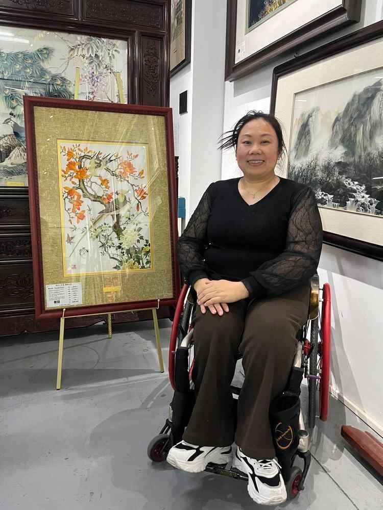 在王老师的鼓励下,潘燕飞下定决心全职投入广绣学习:“王老师说学好通过考核可以入职,我就想试一下,没想到身体能坚持下来。”强大的身体素质,给了潘燕飞坚持下去的身体本钱。