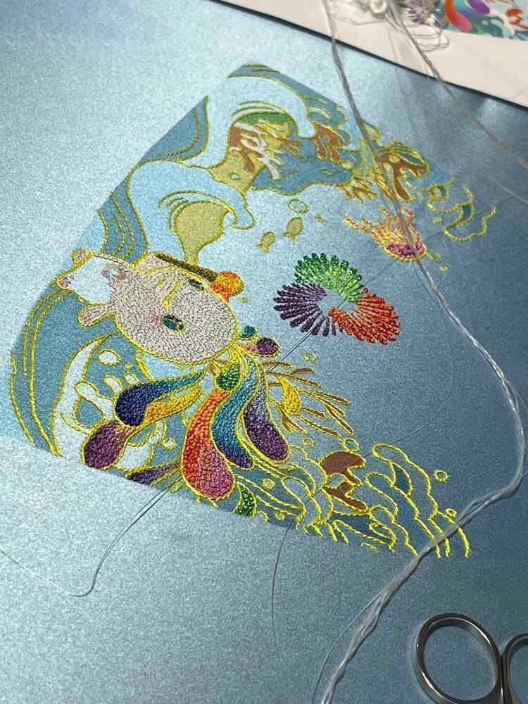 在学习过程中,潘燕飞遇到了不少挑战。“渐变颜色最难,看着图案选的颜色,绣上去感觉不一样,就得拆掉重绣。”她指着正在绣的飘带介绍,“这 5 条飘带我绣了一天还不满意,绣三四针就换一个颜色,要断线、锁针。” 即便如此,她依然乐在其中。