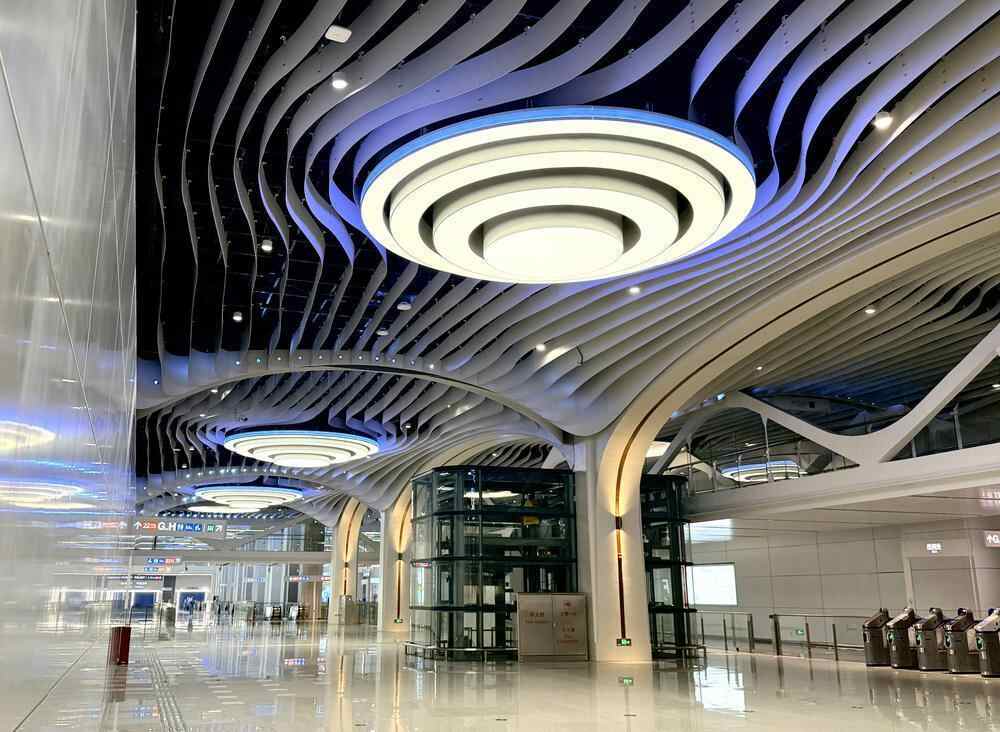 广州地铁设计院二十二号线设计总体易诗轩介绍:“芳村站以‘珠江流转、花开芳村’为设计主题,提取珠江之水以及木棉花开的设计意向,形成统一且具有符号性的设计语言应用在空间设计中,打造广州首座地下空中艺术过街廊桥与十字换乘大厅交相呼应的国际化换乘枢纽。”