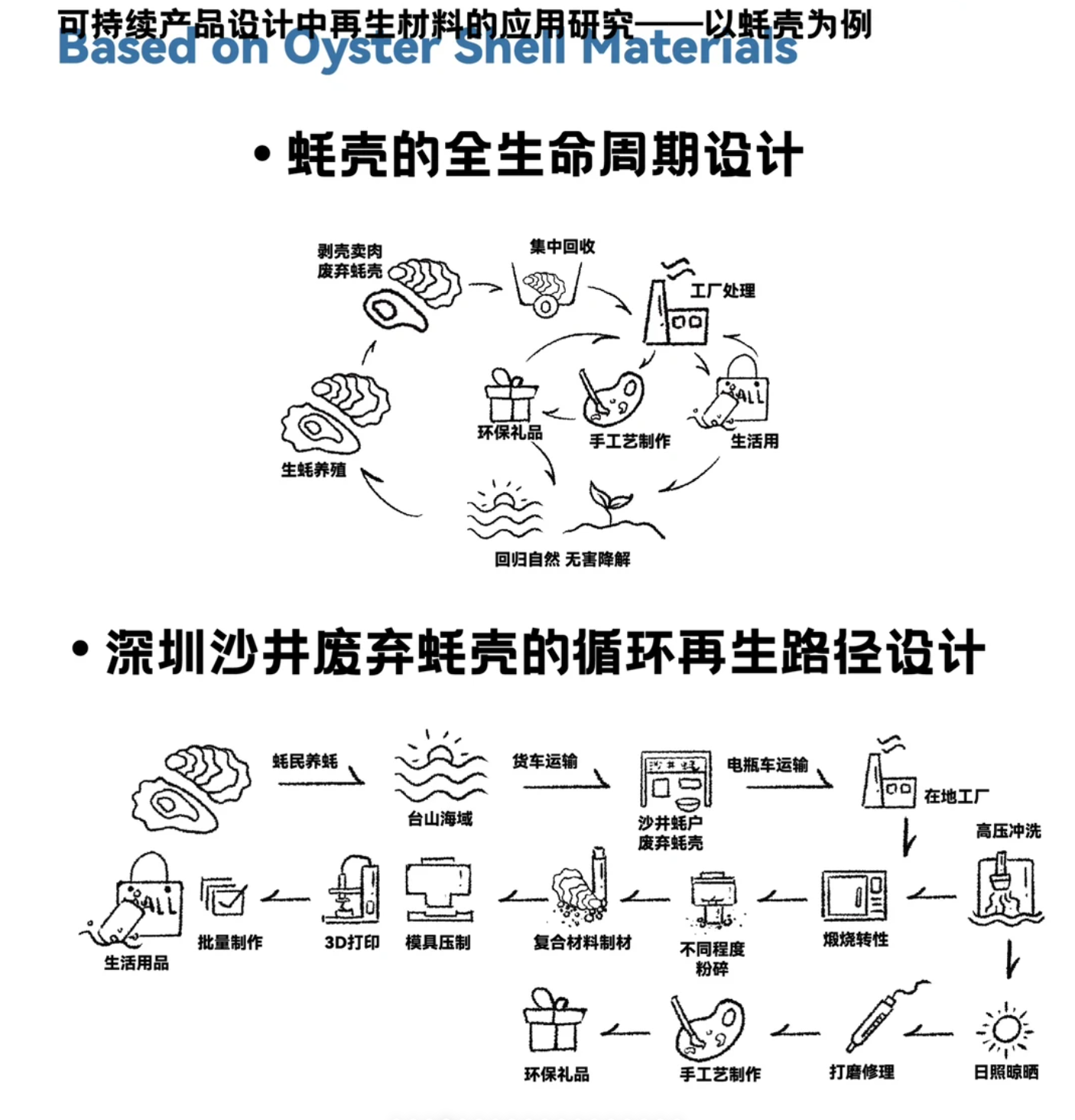 “传统填埋焚烧不仅浪费资源且污染环境。”于是,一个念头在她心底悄然生根:能不能通过设计,让这些“海洋垃圾”重新产生价值?关于再生材料与在地文化的融合、蚝壳材料在产品设计的应用,以及可持续生活方式的实际行动,这些思考不仅是她研究生阶段的学业课题,也是她所热爱的生活哲学。