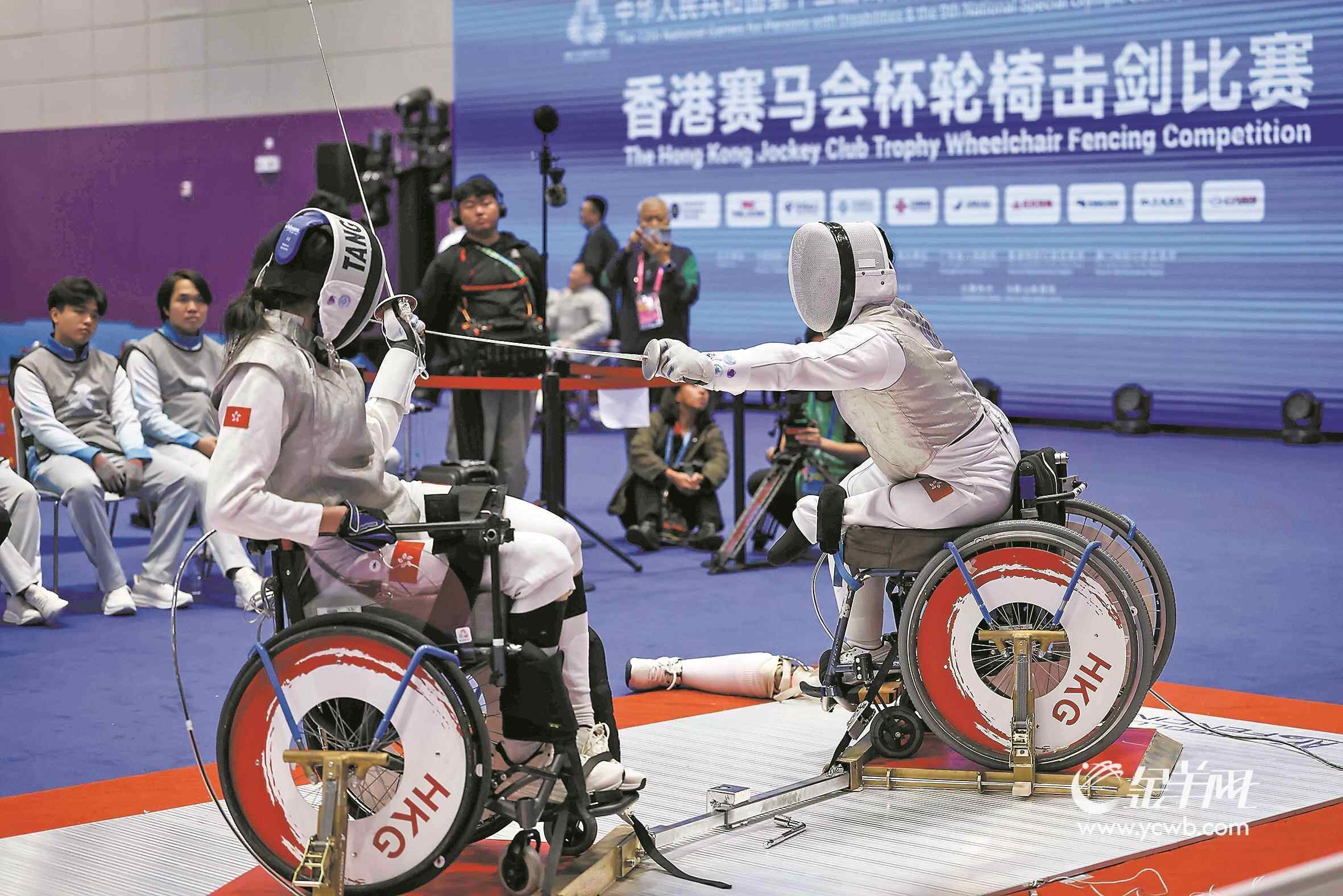 首日比赛,广东轮椅击剑队多名选手上场比拼。“我一直有个武侠梦,击剑是一项很酷的运动,我也想当一回剑客。当时看到广东组队招人,我就报名了。我很喜欢这项运动,训练一年多,我的身体也更强壮了。”广东轮椅击剑队年龄最大的队员梁绍颖说。