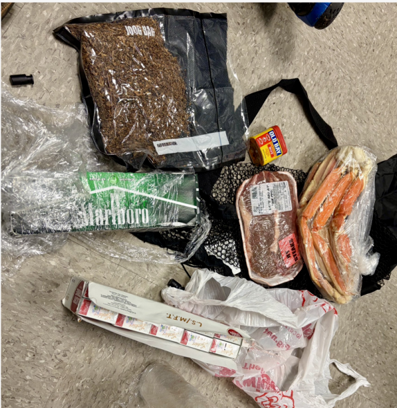 南卡罗来纳州惩教部门帖文配图显示,被查获的包裹中包含牛排、蟹腿、大麻等物品(上图)。报道称,在南卡罗来纳州,在监狱附近操控无人机属于轻罪,最高可判处30天监禁。而向监狱内投放违禁品则属于重罪,最高可判处10年监禁。