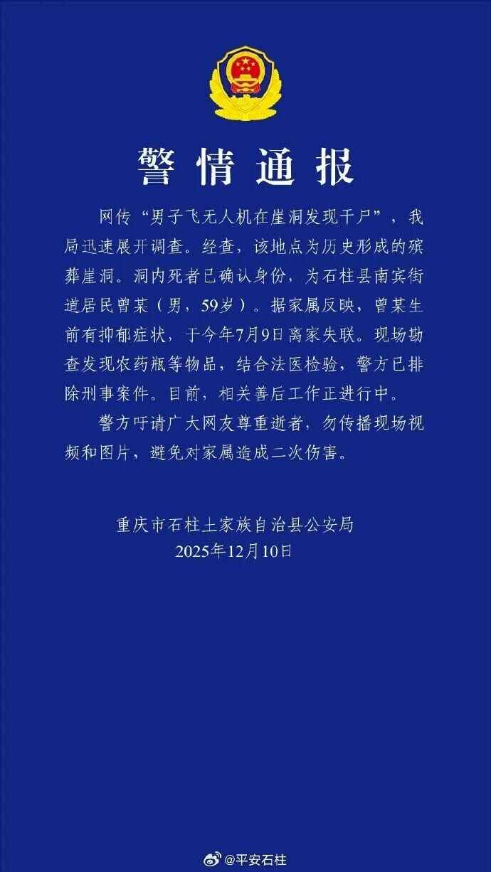 重庆石柱土家族自治县公安局12月10日通报,网传“男子飞无人机在崖洞发现干尸”,该局迅速展开调查。经查,该地点为历史形成的殡葬崖洞。洞内死者已确认身份,为石柱县南宾街道居民曾某(男,59岁)。