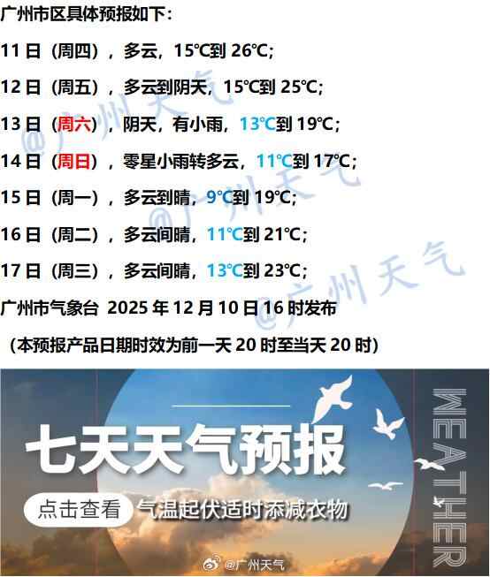 广州方面,这两天云量多,白天和暖夜晚凉,值得注意的是,周末会有降温+降雨双重夹击,注意天气变化。