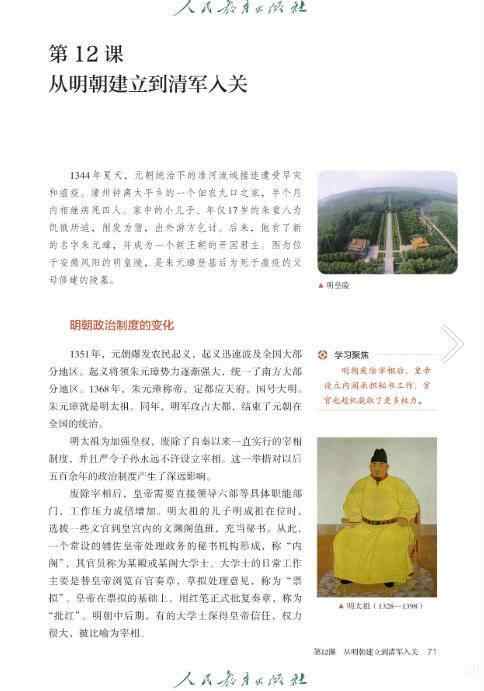 记者查询人民教育出版社官方网站上的内容看到,普通高中教科书《中外历史纲要(上)》和新版的《中国历史 七年级下册》中的朱元璋形象已经替换,相关话题迅速冲上了热搜,大家记忆里一张“鞋拔子脸”的朱元璋一跃成为了“帅哥”,让不少网友加入讨论。实际上,不仅是教材,南京多处景区的画像早已悄然更换。