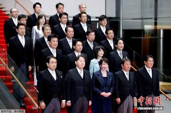 当地时间10月21日晚,日本新任首相、自民党总裁高市早苗组建新内阁。图为日本首相高市早苗(第一排中)在东京的首相官邸率阁僚合影。