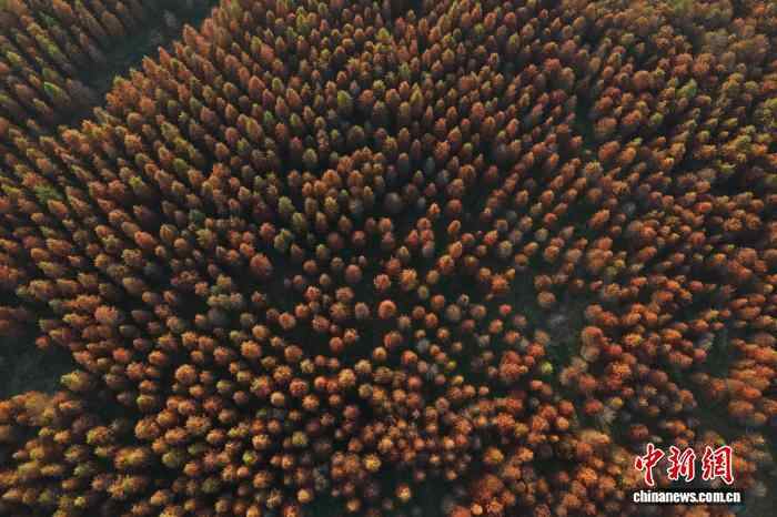 12月16日,浙江黄岩,长潭水库红杉林逐步变色,层林尽染美如画。长潭水库红衫林位于黄岩城西23公里处,地处永宁江上游。近日,这片茂密的杉林以其独特的景致,成为当地热门旅游目的地,吸引各地民众前来游玩、观赏。(无人机照片) 孙杨洋 摄
