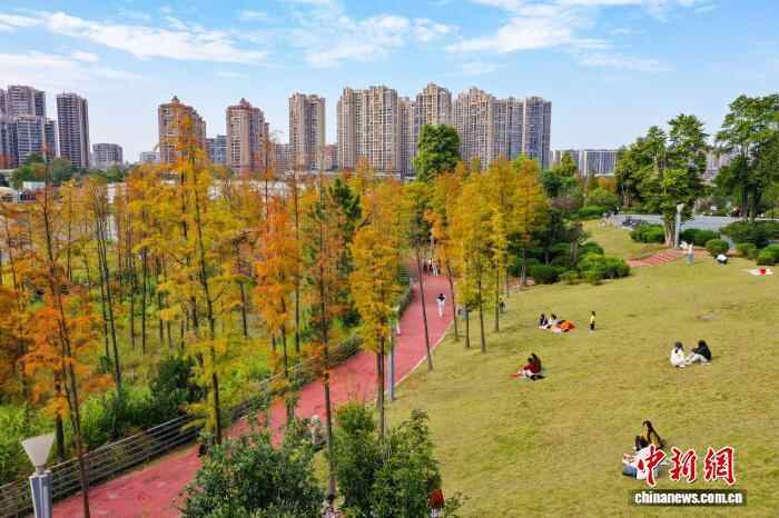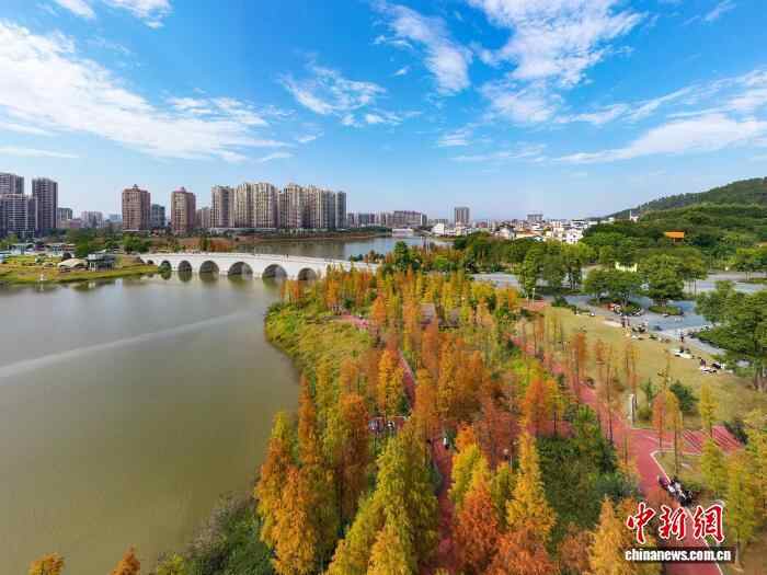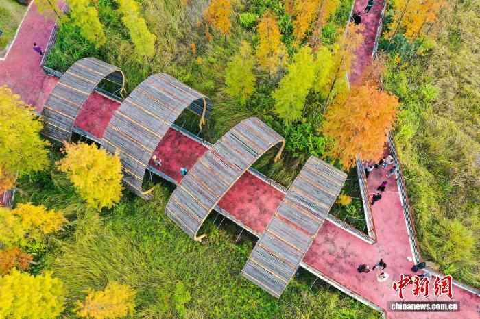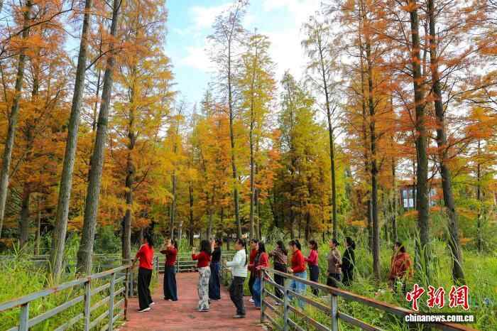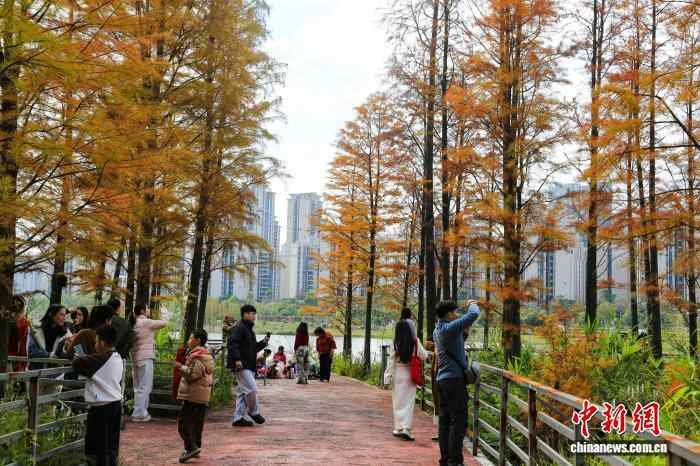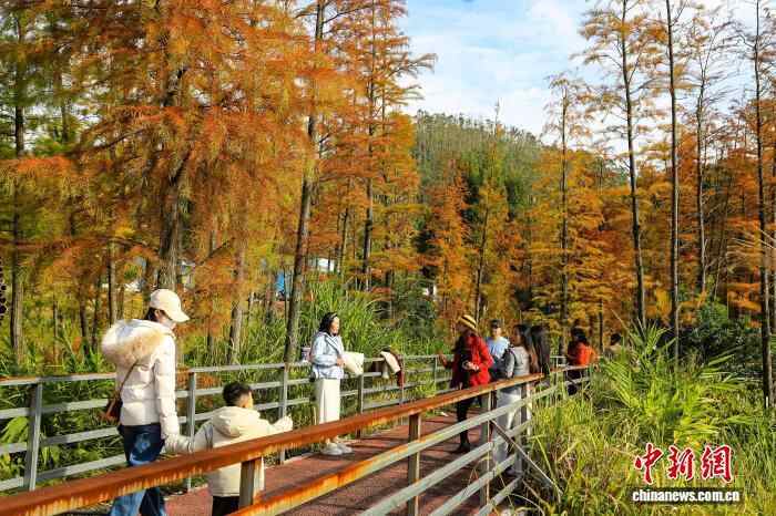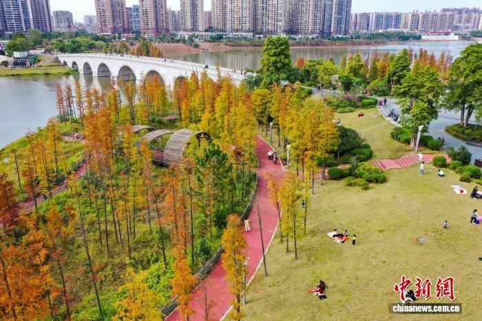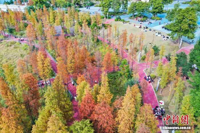 近日,广西梧州市苍海公园水杉由绿转红,层林尽染。彩色步道、湖水与石拱桥相映成趣,构成一幅斑斓的冬日画卷,吸引不少市民游客前来驻足赏景、拍照打卡。图为市民游客在广西梧州苍海公园中游玩。黎杰源 摄