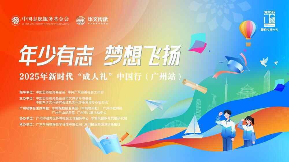 12月21日,2025年新时代“成人礼”中国行(广州站)将在中山纪念堂正式举行。活动由中国志愿服务基金会、中共广东省委社会工作部指导,由中国志愿服务基金会华文传承专项基金主办、中国东方文化研究会红色文化传承发展专业委员会联合主办。广州站由羊城晚报报业集团(羊城晚报社)、广州中山纪念堂、广州市儿童活动中心联合主办,由广州市越秀区传城社会工作服务中心、羊城晚报教育发展研究院协办,由广东羊城晚报数字媒体有限公司承办。