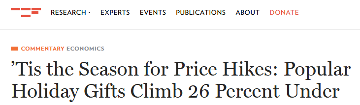 根据无党派智库世纪基金会(The Century foundation)、基石合作组织(Groundwork Collaborative)与美国教师联合会(AFT)的最新联合分析,这个假日季美国许多热门节日礼物的价格大幅上涨,平均涨幅达26%,接近美国当前整体通胀率的九倍。无论顾客在哪个货架间穿梭,都会发现价格普遍上涨:家居用品和厨房用品的价格上涨了38%,电子产品上涨了34%,服装、鞋类和配饰上涨了20%,玩具和游戏上涨了17%。