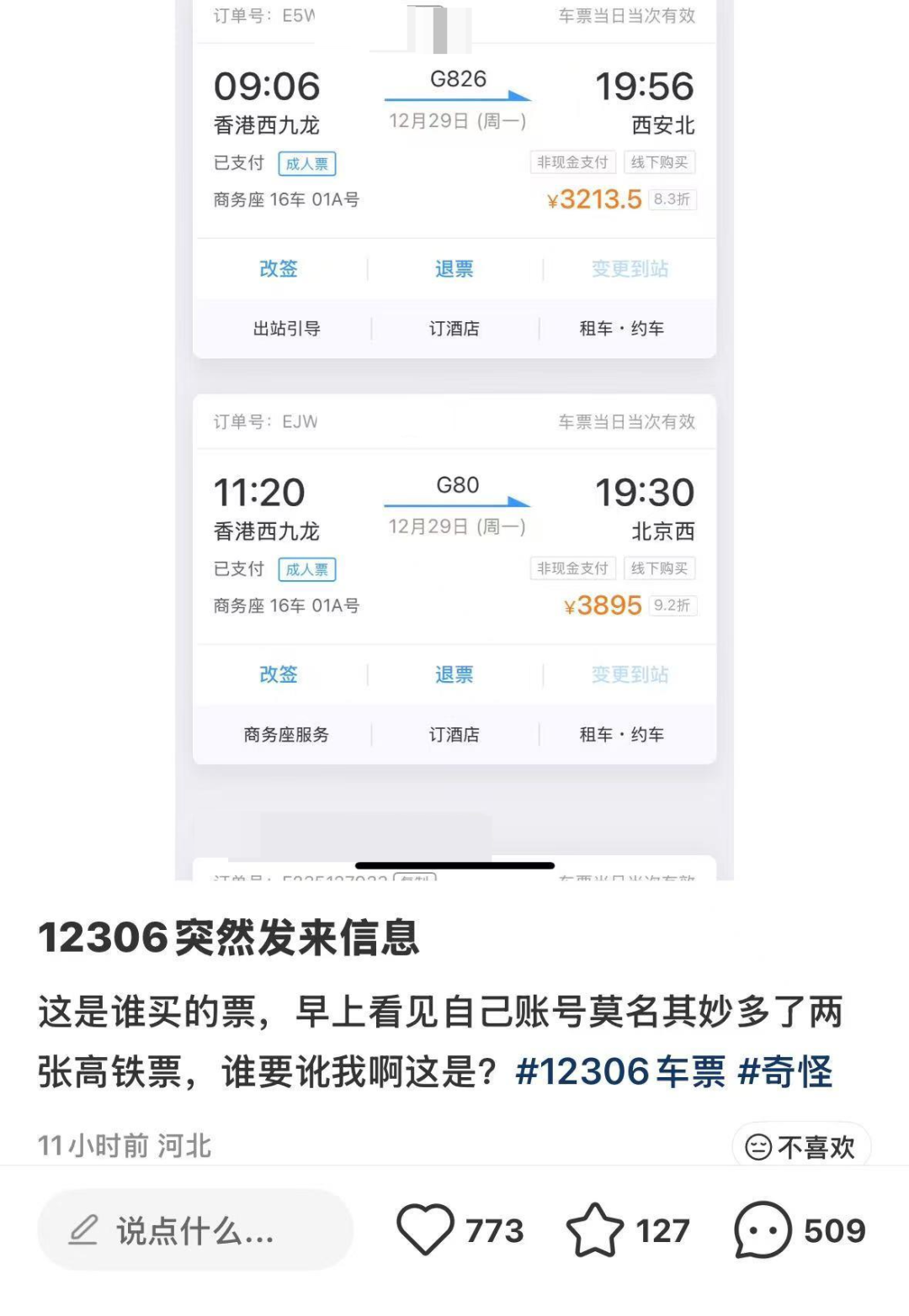 12月16日,一河北网友发帖称,她的12306账户内突然出现两张始发站为香港西九龙的高铁票。车票信息虽然是她的个人信息,但她并没有在线下或者线上购票,也没有出行计划。在致电平台客服后,该网友进行了退票处理。16日下午,12306回应记者称,此类情况可能因个人信息泄露导致,建议旅客遇此情况及时办理退票并修改12306账户密码。