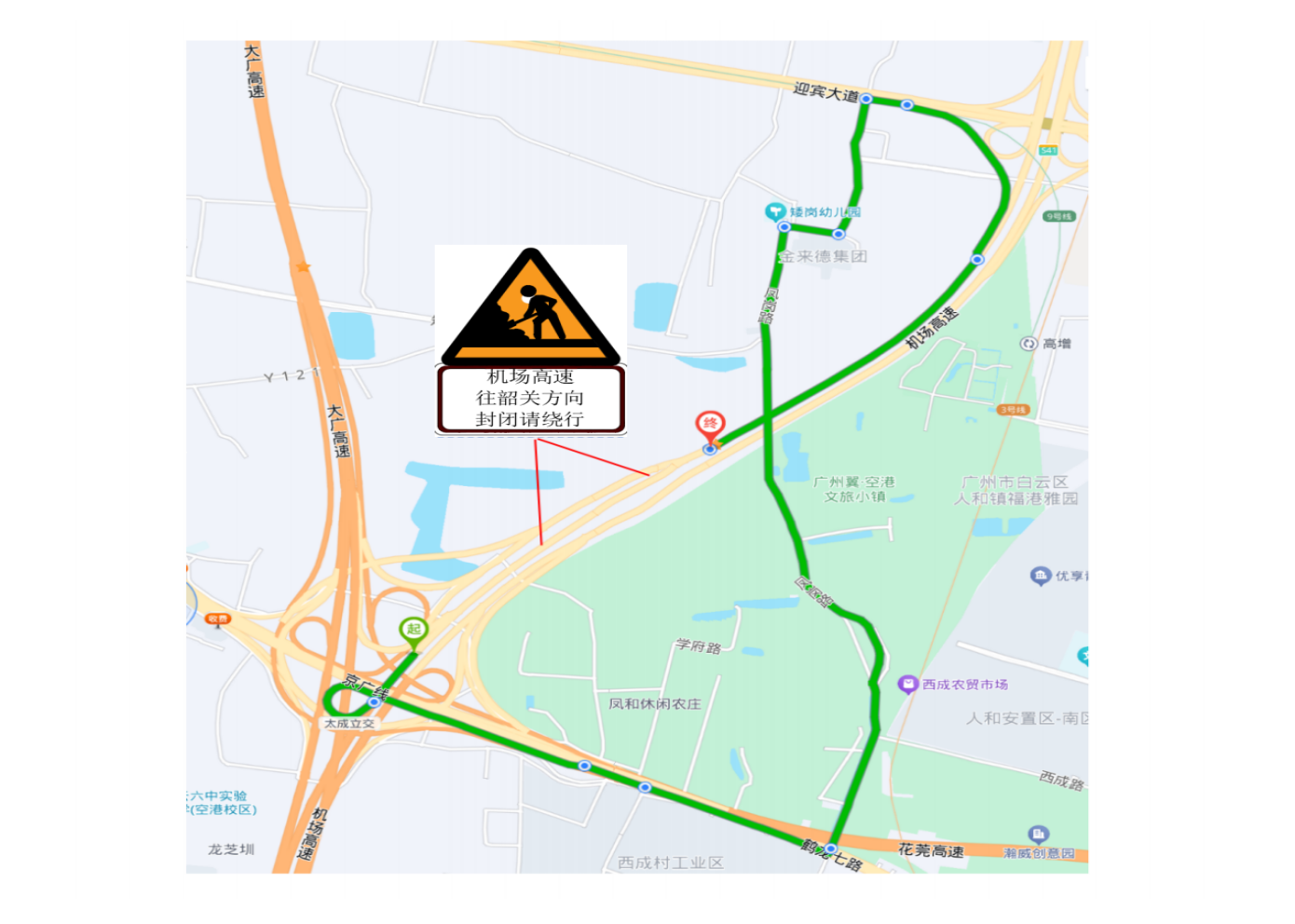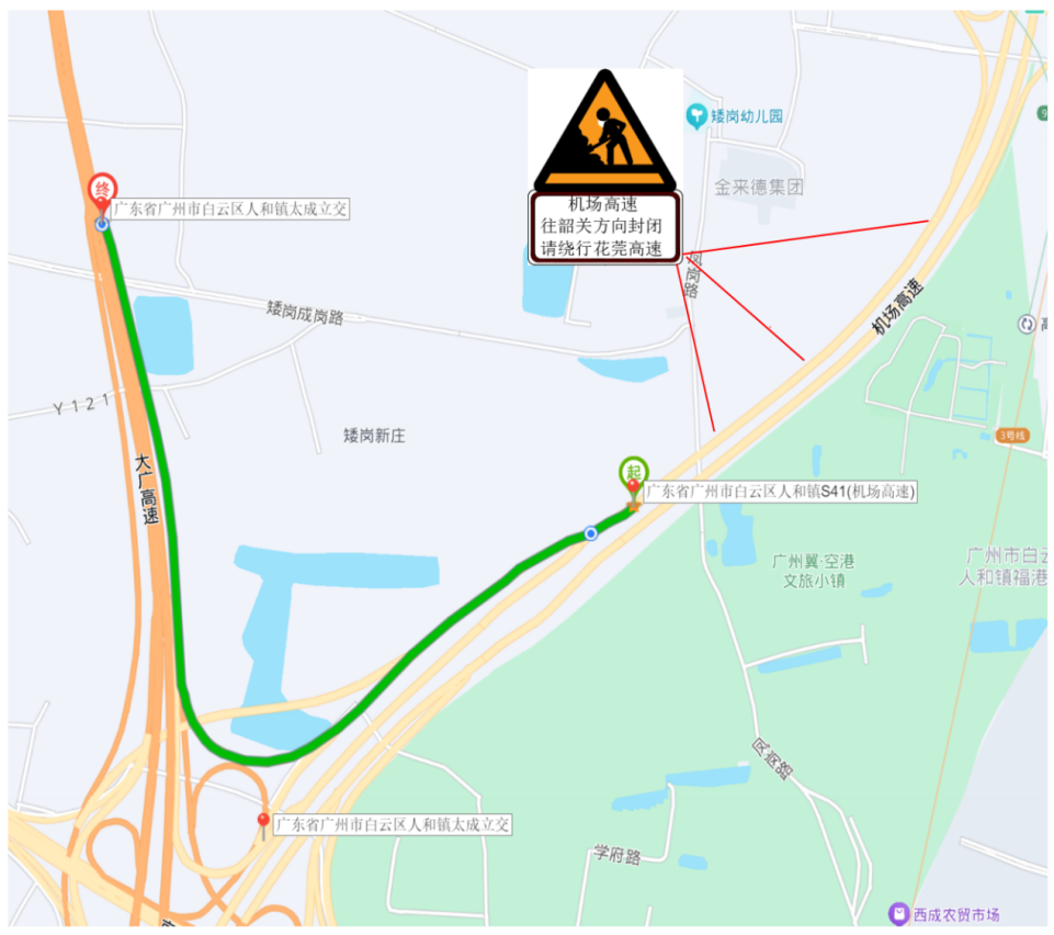 A5匝道封闭期间,市民可参照如下路线绕行:机场高速南行—经花莞高速收费站进入花莞高速—靠左行驶经过第一出口—在第二出口往G45大广高速从化、韶关方向—抵达大广高速。