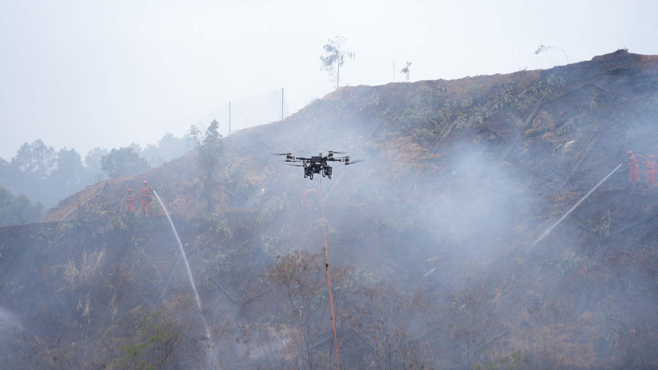 演练充分融入科技力量。由于地形复杂、风力加大,火势难以控制。现场指挥部向省、市请求增援。演练进入高潮——科技与新质战斗力成为主角。