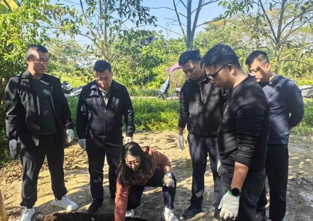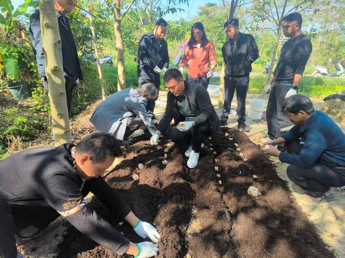 此次活动由工作队队长兼南溪镇党委副书记马文广带队,驻新溪村第一书记蒋士军、驻南溪村第一书记陈浩佳、工作队队员邓伟结全程参与,仲恺农业工程学院农业与生物学院宋佳歌教授作为农村科技特派员提供专业技术支撑。为破解村民种植无资金、无技术、无菌种的难题,工作队主动出资捐赠种植所需基质,宋佳歌教授所在研究所免费提供优质菌种,创新采用 “工作队+科技特派员+农户” 的模式,由农民出地、出劳动力,工作队与科技特派员全程跟进指导,共同打造红松茸种植示范基地,以点带面激发村民种植热情。