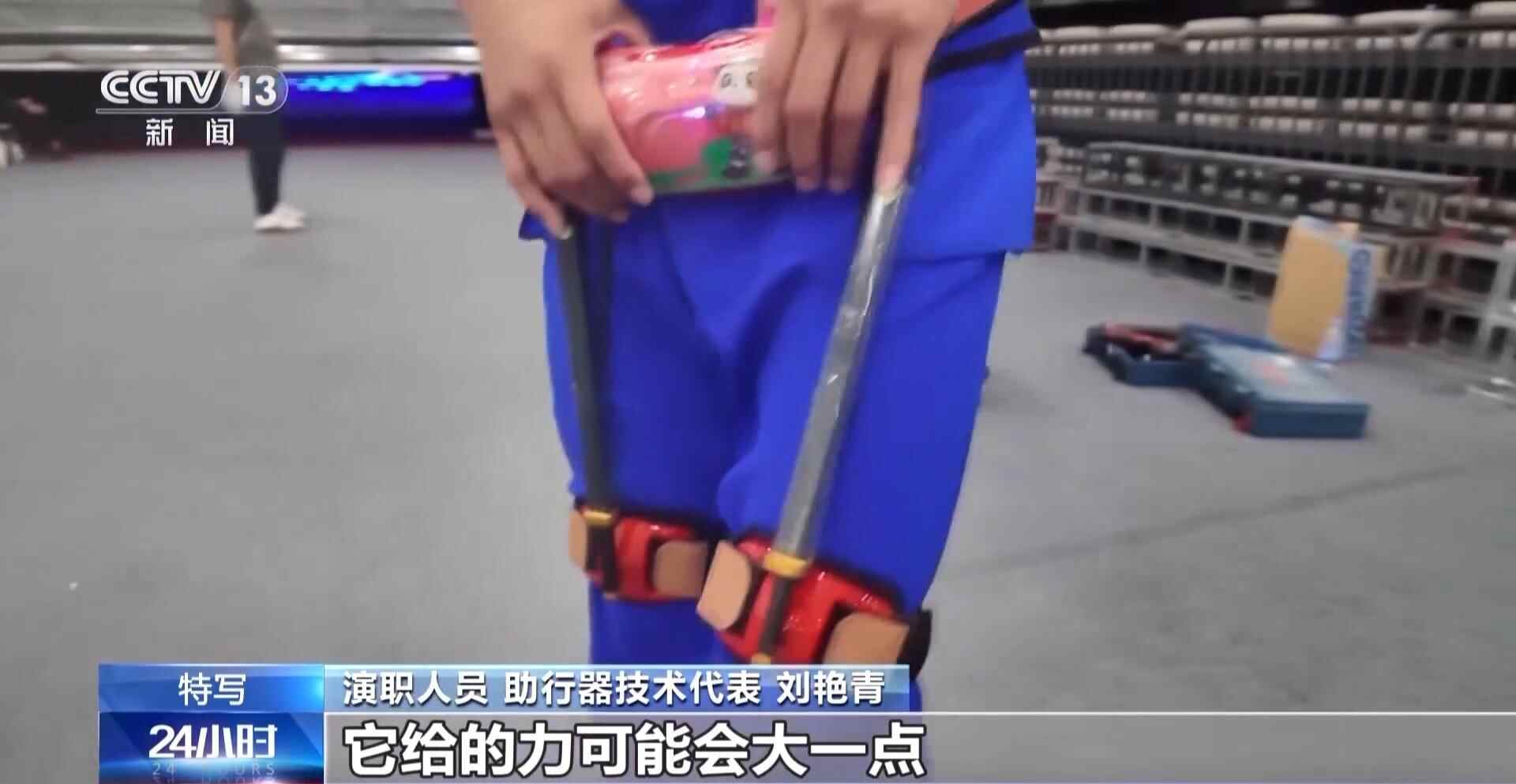 演职人员、助行器技术代表 刘艳青:我们带来的是一个下肢助行器,帮助下肢力量不足的人群重新获得腿部力量,帮他去行走。它里面有AI芯片,时时刻刻感知我们的动作意图,比如说腿部抬高一点,它给的力可能会大一点。