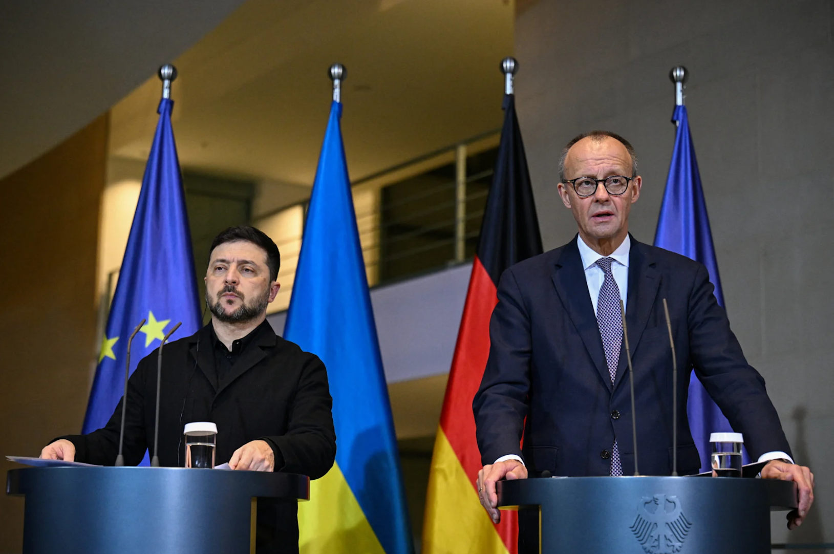 △当地时间15日,乌克兰总统泽连斯基与德国总理默茨在柏林举行联合记者会