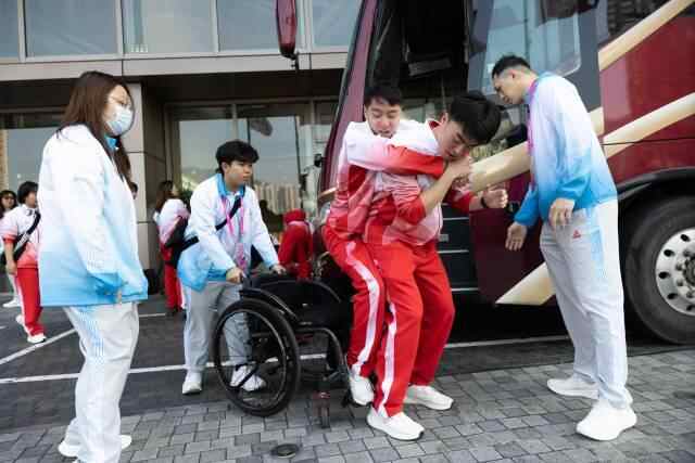 出发前,助教张健忠将行动不便的队员们逐一抱上大巴。