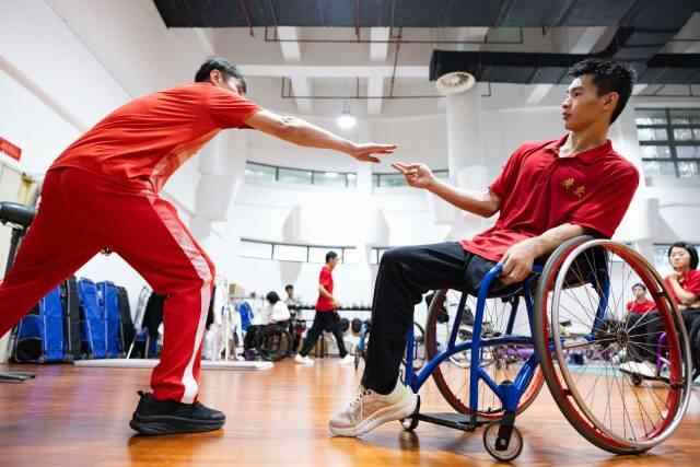 早上,队员们在操场刷圈,轮椅在跑道上向前转动,一圈又一圈。转入训练馆,队员们换上厚重的训练服,反复练习出击、躲闪等动作,汗水顺着脸颊不断滑落。