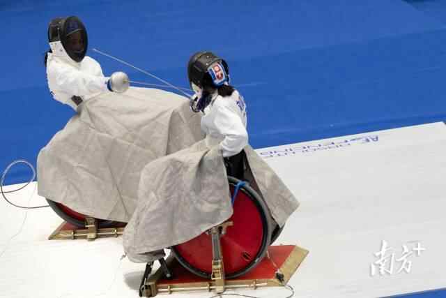 10日,轮椅击剑项目女子个人重剑C级金牌战打响。虽然是一场“广东德比”之战,广东省轮椅击剑队教练龙杰还是静静站在赛场边,盯着队员们的每一个动作。