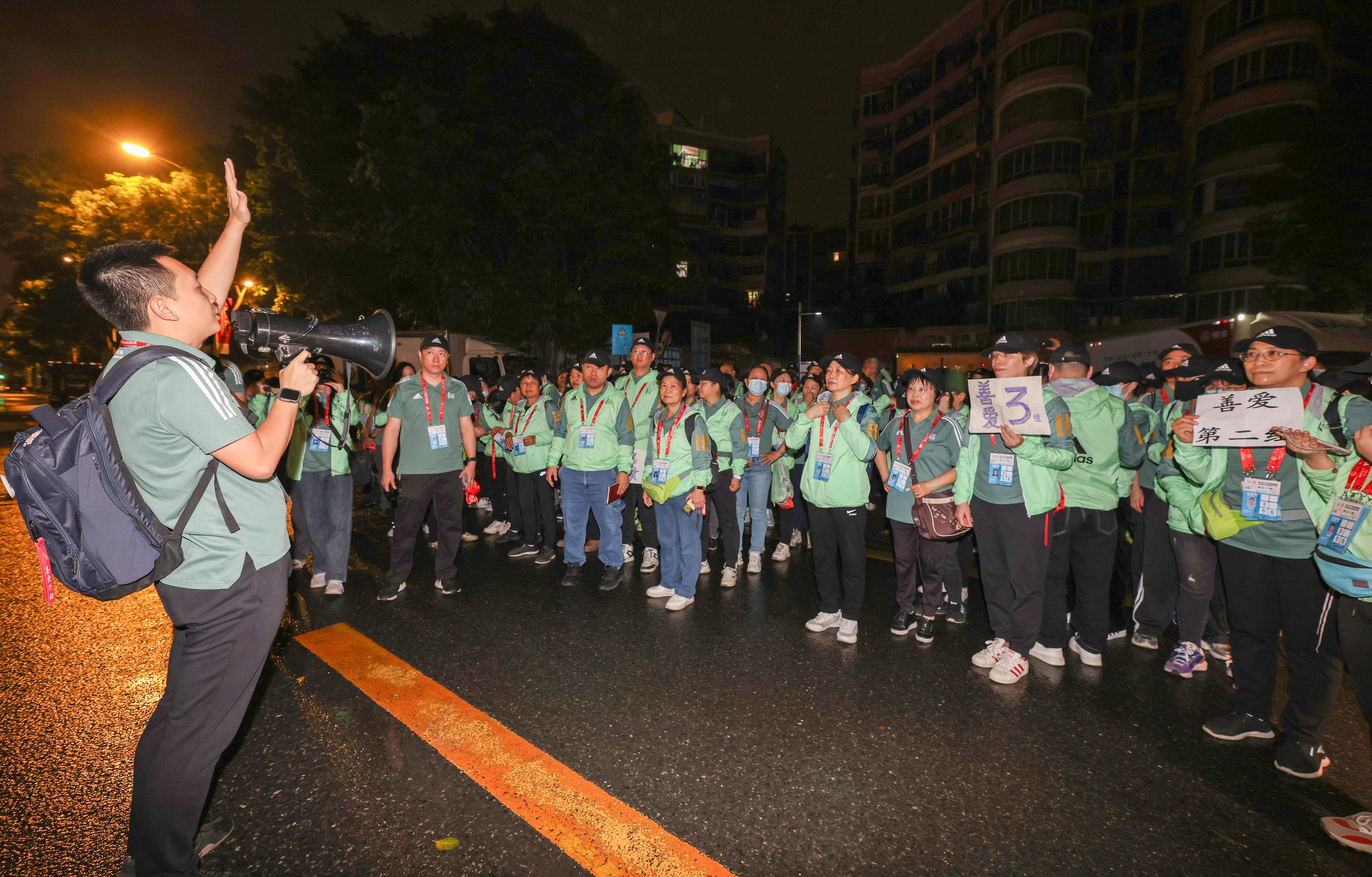最深刻的记忆,往往与特殊的天气相连。2018年那个寒冷的广马清晨,冷雨淅沥,气温骤降。欧宇勤和伙伴们守在体育中心各入口,负责紫光检录。每个人都套着薄薄的雨衣,在寒风里站得笔直。选手们也都裹着雨衣,志愿者们需要不断重复:“不好意思,请把雨衣掀开一下,需要查验号码簿。”寒冷让动作僵硬,重复的解释偶尔也会遇到选手的不解与催促,但没有人离开岗位。“几十号人,就在那寒风里,守着,一遍遍说着,那一刻,真的很触动。”那份在低温中凝结的专注与耐心,至今令他难忘。