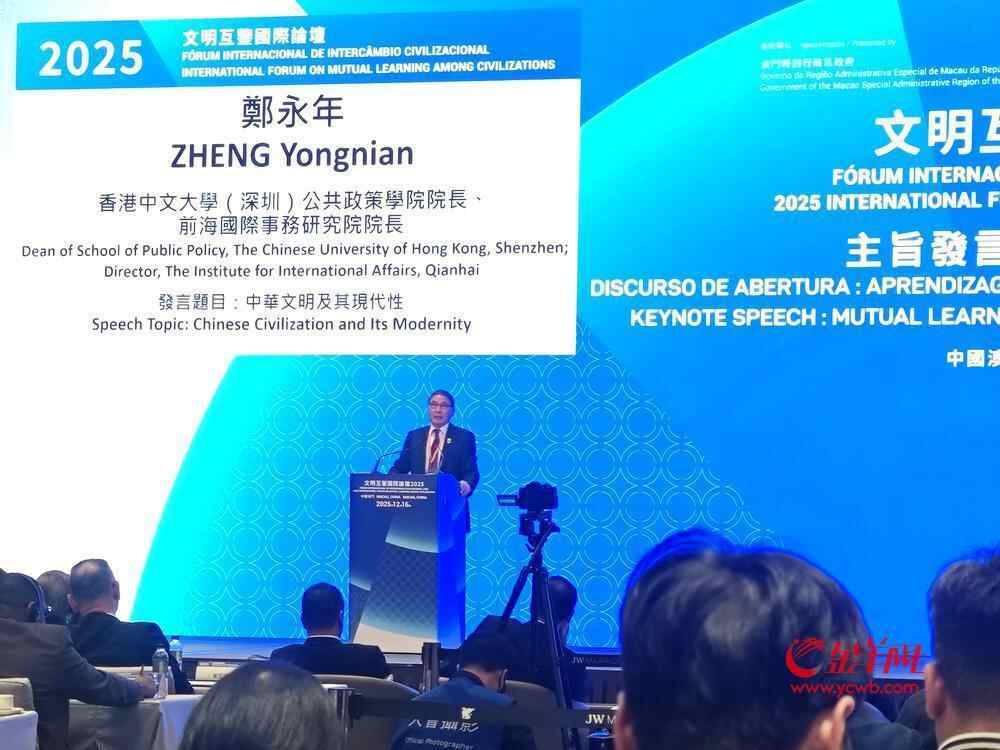 12月16日,首届“文明互鉴国际论坛”在澳门启幕。在当天上午举行的主旨发言环节,香港中文大学(深圳)公共政策学院院长、前海国际事务研究院院长郑永年指出,中国式现代化的成功在于其具有两个本质性特征:一是在拥抱世界的同时,走自己的路;二是在自己发展起来之后,把自己爬上来的梯子伸出去,帮助其他国家也发展起来,构建人类命运共同体。