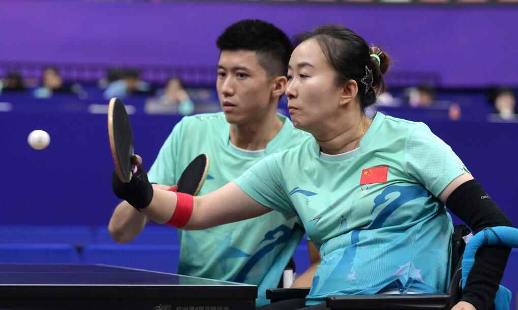 图为2023年10月26日,毛淋(前)和队友翟翔在杭州第4届亚残运会乒乓球混合双打4级B组的比赛中。新华社记者 李贺 摄