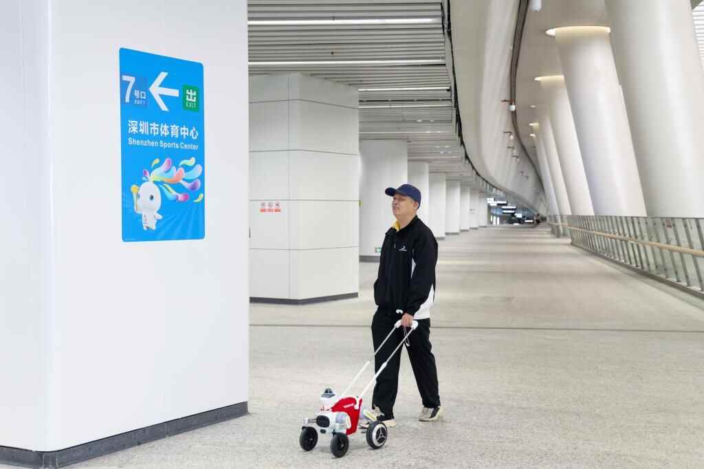 12月13日,在深圳地铁黄木岗交通枢纽,视障乘客体验智能导盲犬。新华社记者 梁旭 摄