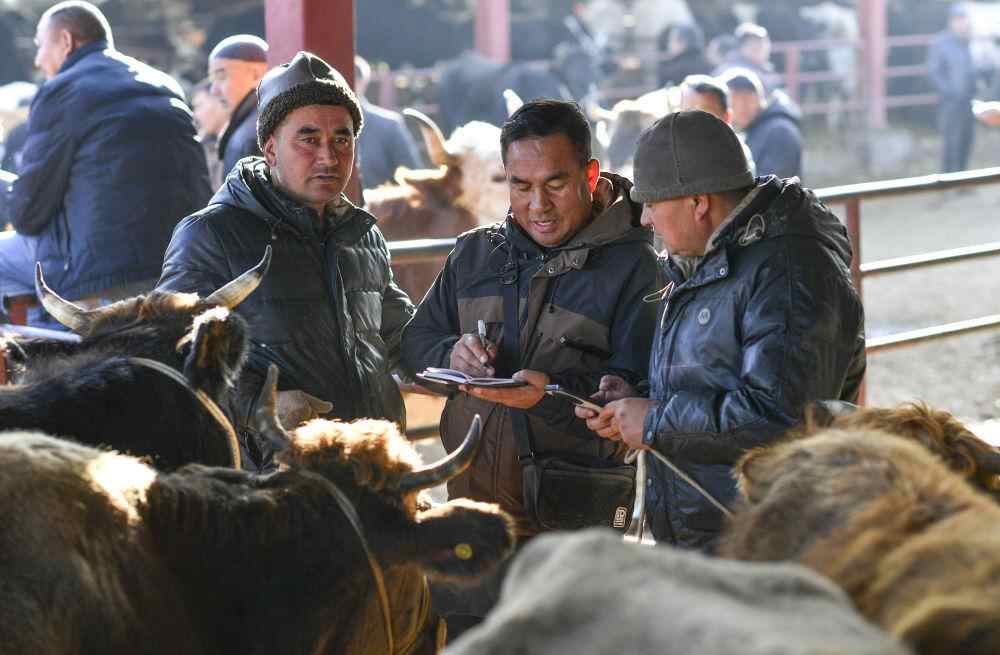 牲畜经纪人马军(中)带着来自青海的客户(左)在新疆创锦黄公农产品交易市场上选购牛。