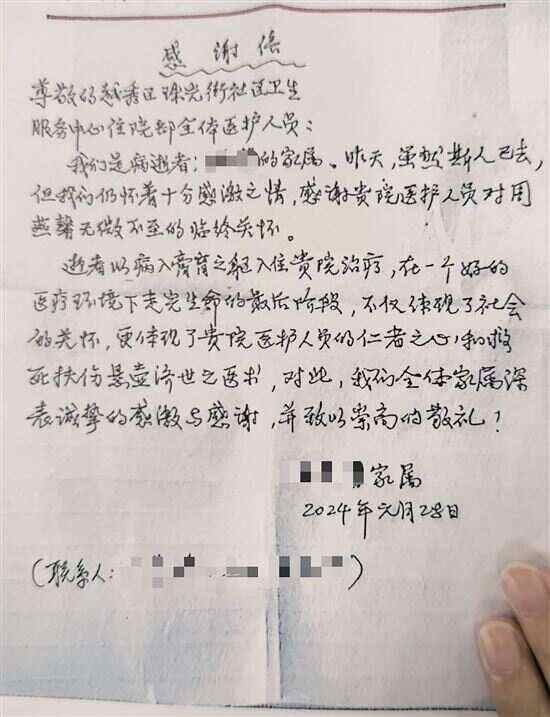 办完兰姨后事没多久,玲姨将一封亲手写的感谢信送到珠光街社区卫生服务中心。她感激地说:“姐姐孑然一身,但她最后的时光身边天天都有人探望和嘘寒问暖,走得不孤单,感谢医护人员和社工的关怀和照顾。”