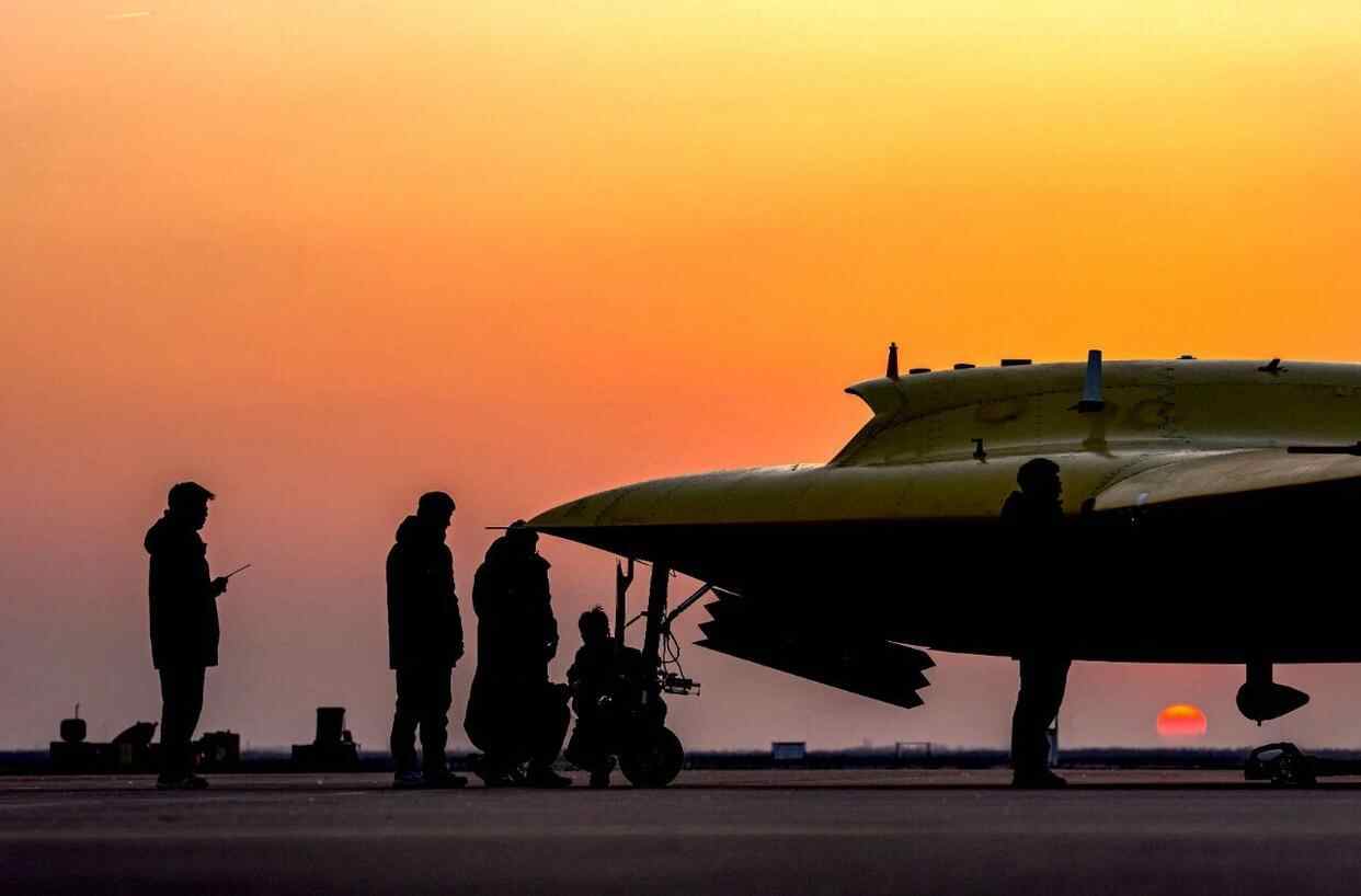拂晓将至,东方天际线渐渐泛起鱼肚白。被牵引至指定位置的彩虹-7无人机,其独特的大展弦比飞翼式布局在熹微晨光中显现出流畅而充满未来感的轮廓。