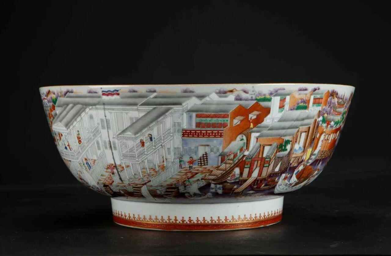 该大碗圈足外壁一圈矛头状边饰装饰,碗内部中央绘有一个花篮。这种大碗是欧洲人在宴会上调盛果酒之用,也称潘趣碗。外壁以通景彩绘方式描绘了广州十三行商馆的面貌。十三行对于广州乃至整个中国的对外贸易史都有着重要的历史意义,描绘清代十三行风景题材的艺术品以外销画为多,广彩瓷传世甚少,极为珍贵。
