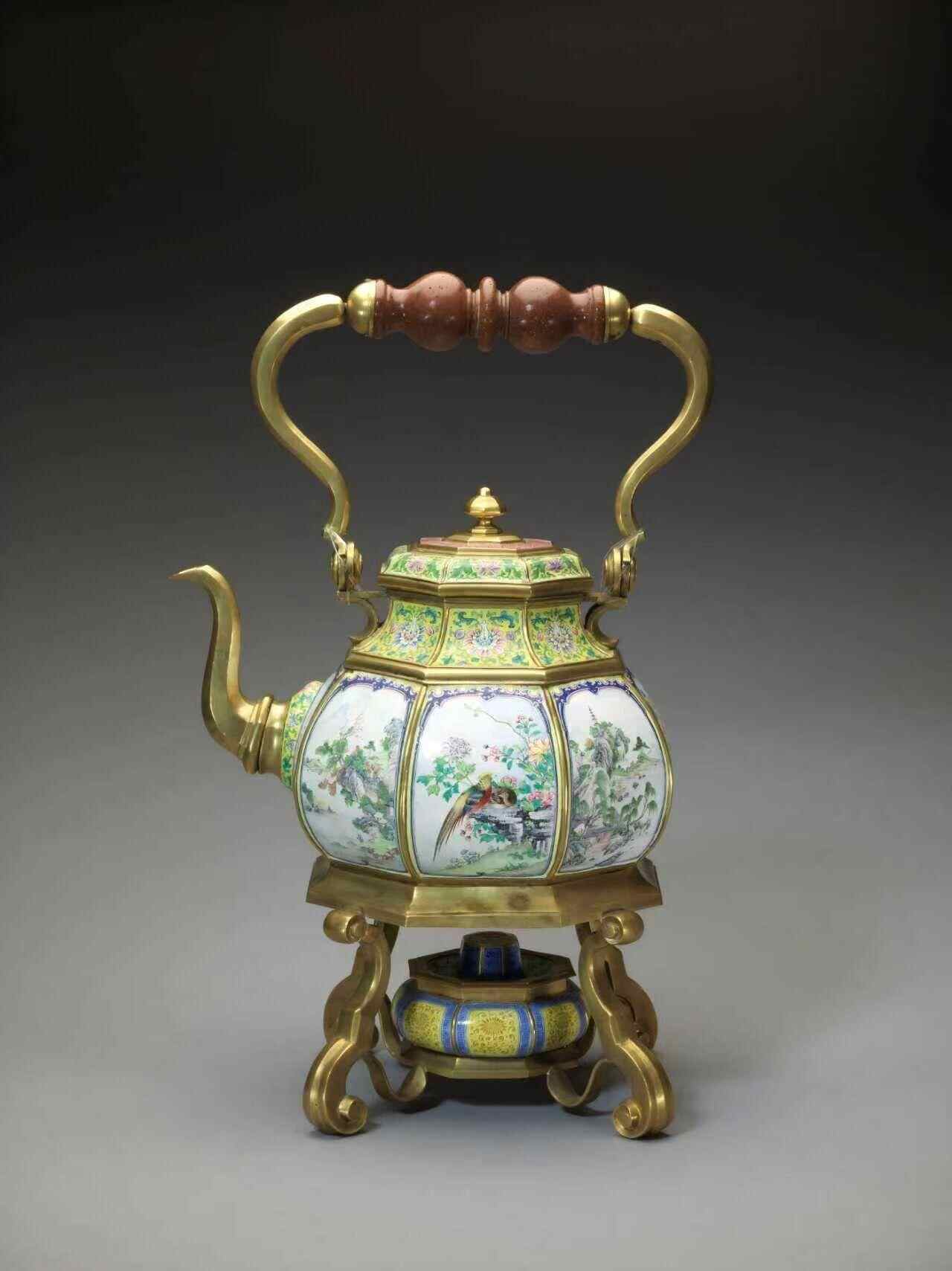 提梁壶铜胎鎏金,八棱形,腹部八面开光饰四季花鸟与山水图案。台座中央置八方扁瓶式油缸,供点火加热用。它的造型风格和结构设计,同欧洲本土制造的同类器物以及广东制造外销产品,展现出极高的相似性,表明此时贸易网络产生逆向影响,反哺国内高端工艺品的设计体系。