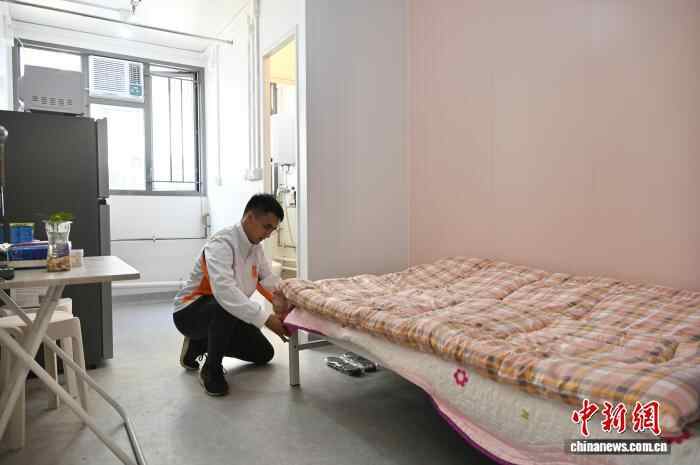 12月12日,过渡性房屋项目“七星荟”项目主任庞学旻在位于香港元朗的“七星荟”过渡性房屋内整理设施。 中新社记者 李志华 摄