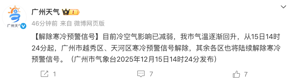 不过,目前冷空气影响已减弱,广州气温逐渐回升,从15日14时24分起,广州市越秀区、天河区寒冷预警信号解除,其余各区也将陆续解除寒冷预警信号。