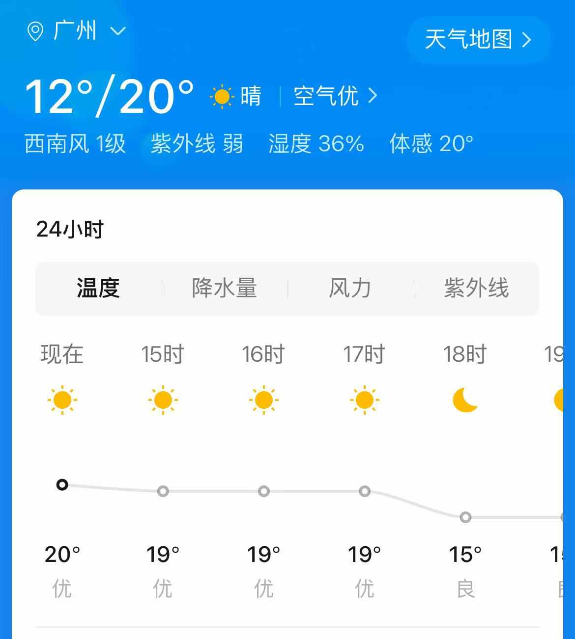 广州这几天晴朗少云,夜间天空没“被子”,地面热量跑得快,降温更厉害(学名:晴空辐射)。白天“没伞”,阳光直射大地,气温升得快。