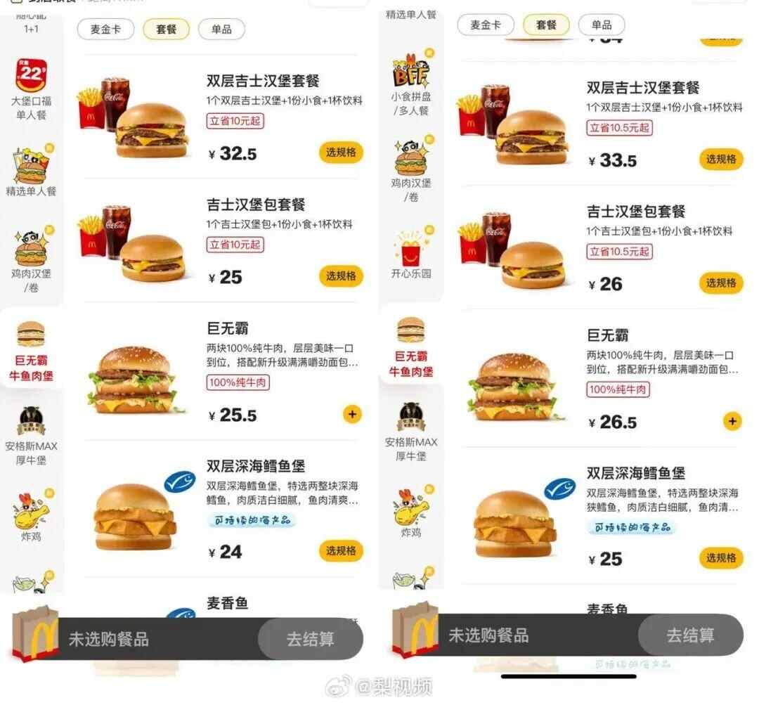 麦当劳小程序菜单显示,巨无霸、双层深海鳕鱼堡、麦香鱼等经典汉堡单价均上涨1元;麦乐鸡、那么大鸡排等小食也涨价1元,麦麦脆汁鸡、中份薯条等则上调0.5元,麦旋风、新地等甜品同步涨价0.5元。