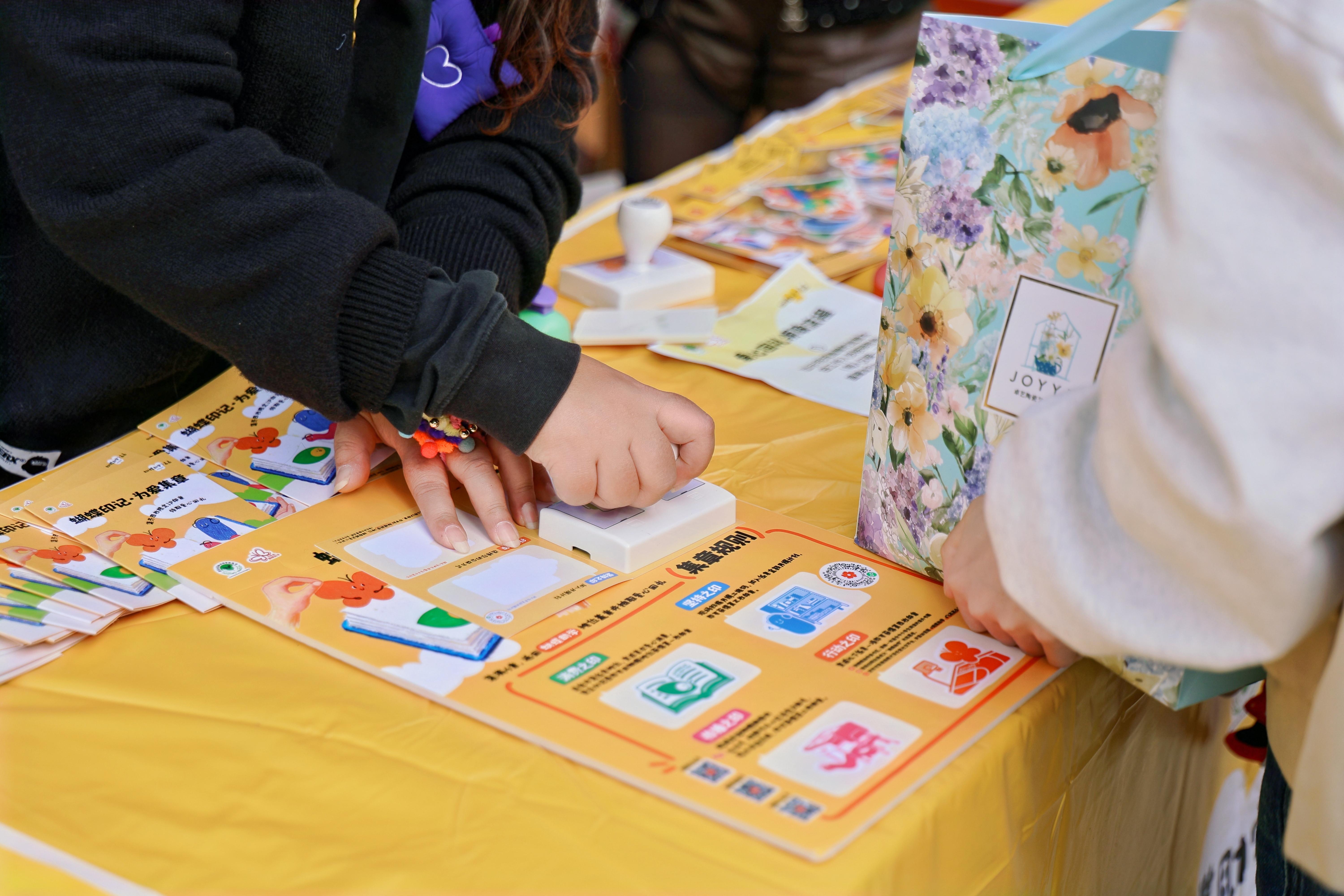 区别于传统义卖,本次市集精心设计了贯穿全程的“公益集章”探索之旅。参与者领取专属集章手册后,可通过在爱心摊位消费、参与闲置公益童书捐赠、注册成为志愿者等趣味任务收集印章。完成打卡后,不仅能兑换爱心回礼,更可集齐四枚与助学项目相关的爱心印章,直观了解善款如何化为乡村学校的图书、课桌、操场。