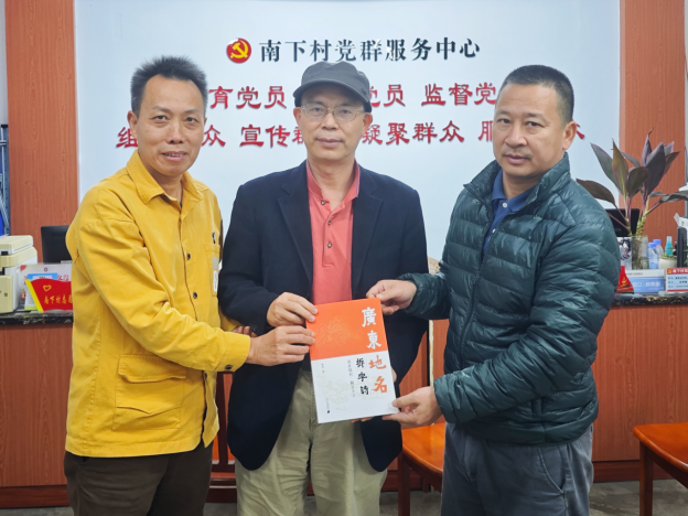 在南下村村委会,杨钦郑重将《广东地名拆字诗:说县镇村,解百千万》一书赠予该村。这本书以“拆字作诗”为核心创作手法,通过解构重组地名偏旁部首,巧妙融入地域历史典故、民俗风情与发展现状,共收录广东省内424个各级地名诗作。书中每首五言古体诗均搭配详实注解与地域特色实景照片,以图文并茂的形式,生动解读地名背后的文化故事与发展脉络。其中,针对松口镇创作的诗作“公木头纳凉,松影思南洋。移民二一二,口碑有广场”,精准呼应了该镇“客家人下南洋第一站”“中国移民纪念地”的历史定位,让地方文化记忆跃然纸上。