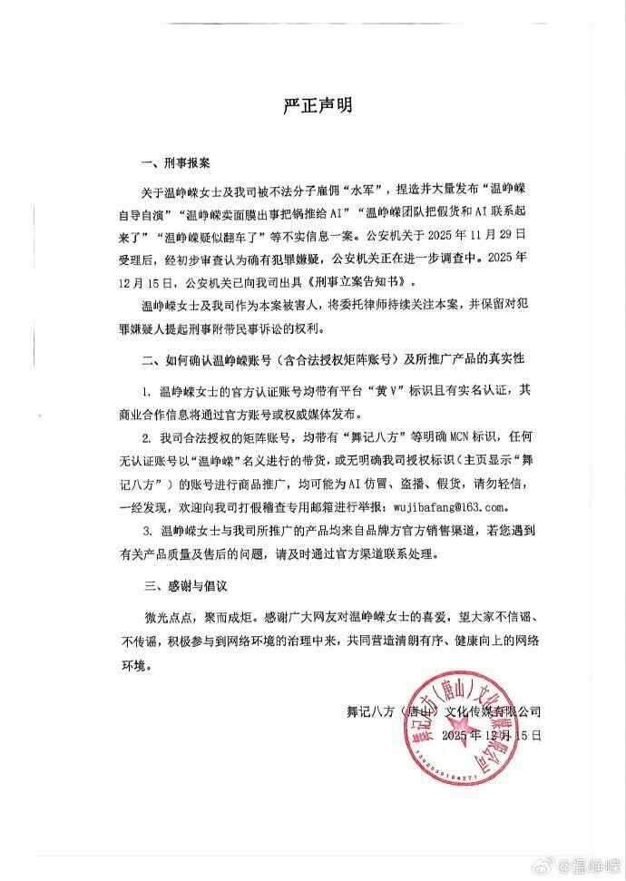 12月15日,温峥嵘在社交平台发文称:报警,已立案。