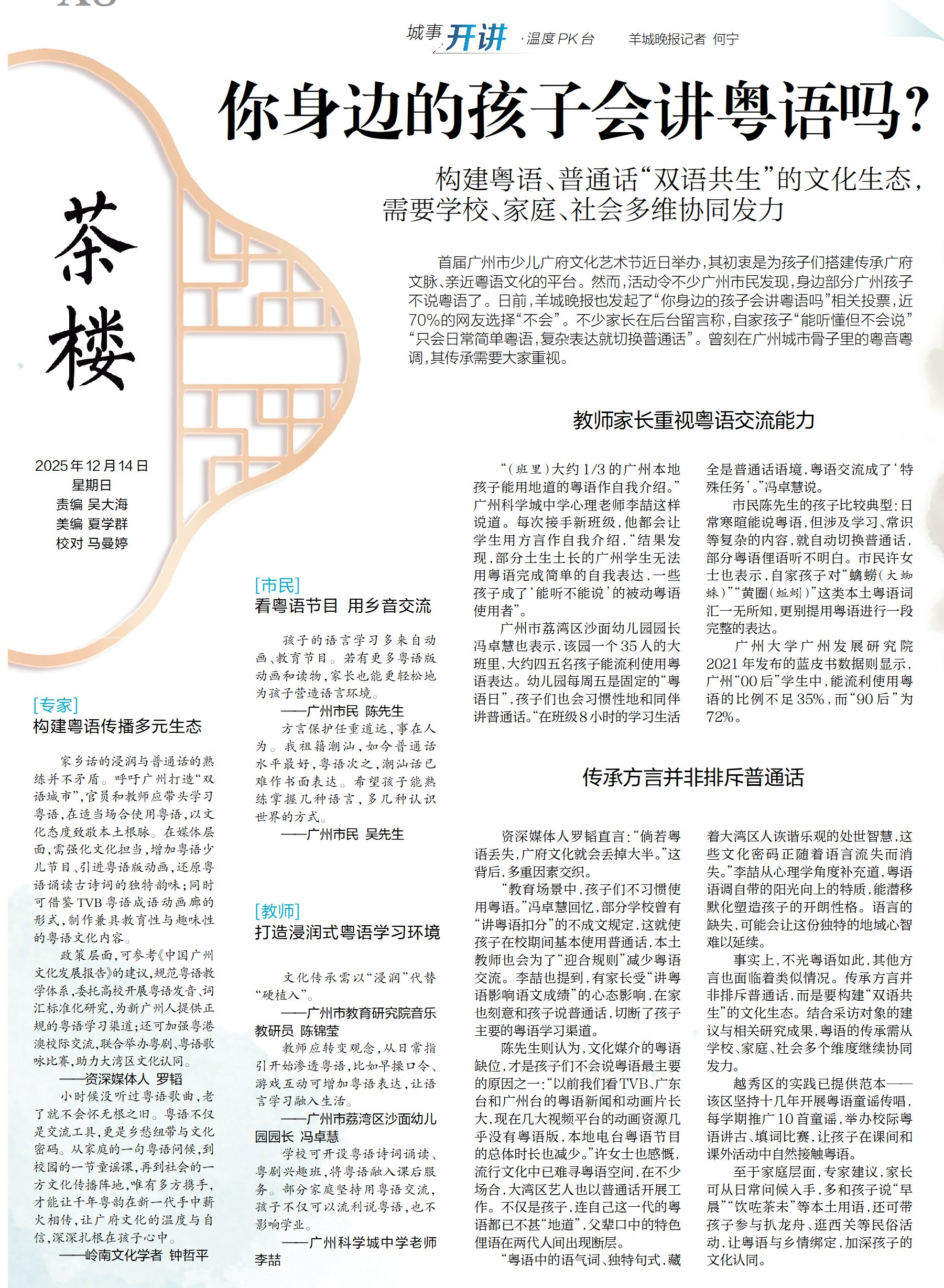 日前,羊城晚报也发起了“你身边的孩子会讲粤语吗”相关投票,近70%的网友选择“不会”。不少家长在后台留言称,自家孩子“能听懂但不会说”“只会日常简单粤语,复杂表达就切换普通话”。曾刻在广州城市骨子里的粤音粤调,其传承需要大家重视。