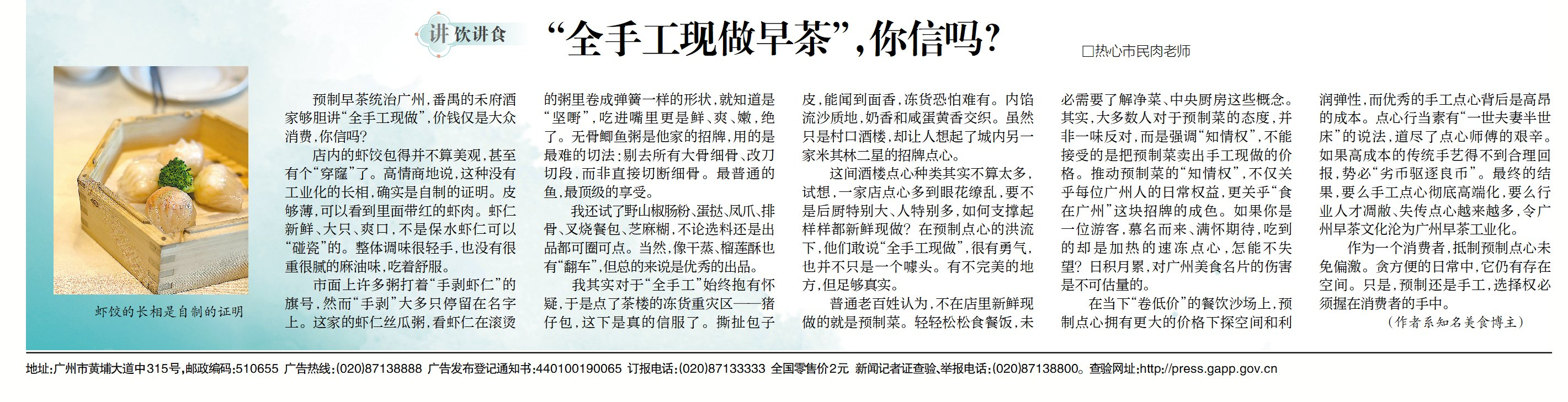 推动预制菜的“知情权”,不仅关乎每位广州人的日常权益,更关乎“食在广州”这块招牌的成色。如果你是一位游客,慕名而来、满怀期待,吃到的却是加热的速冻点心,怎能不失望?日积月累,对广州美食名片的伤害是不可估量的。