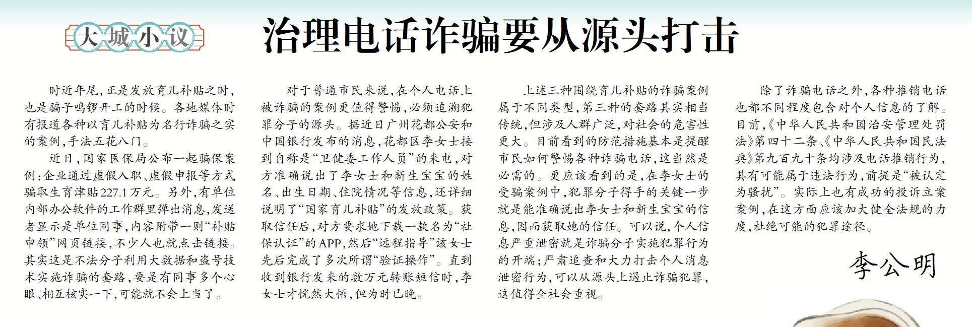 更应该看到的是,在李女士的受骗案例中,犯罪分子得手的关键一步就是能准确说出李女士和新生宝宝的信息,因而获取她的信任。可以说,个人信息严重泄密就是诈骗分子实施犯罪行为的开端;严肃追查和大力打击个人消息泄密行为,可以从源头上遏止诈骗犯罪,这值得全社会重视。